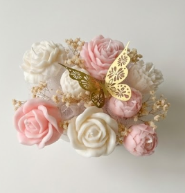 تميزي بتقديم هدية فريدة تجمع بين الأناقة والابتكار. هذا التنسيق عبارة عن حقيبة شفافة فاخرة تحتوي على باقة من زهور الشمع المعطرة بألوان الوردي والأبيض، منسقة بعناية مع لمسات من الورد المجفف وفراشة ذهبية رقيقة.